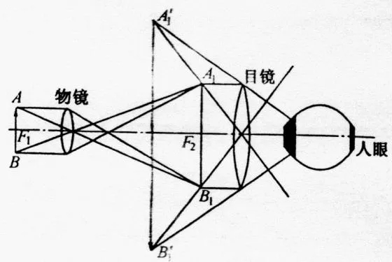 在金相显微镜中装有两组放大透镜,靠近物体的一组透镜称为物镜,靠近眼睛的一组称为目镜,被观察的物体AB置于物镜的前焦点F1稍远的位置,由物体反射的光线穿过物镜,经物镜折射后获得一个放大的倒立实像A1B1,它正好位于目镜的前焦点F2以内,因而目镜以将其再次放大成倒立的虚像A2B2,这就是我们在显微镜下观察到的经过两次放大后的物像。